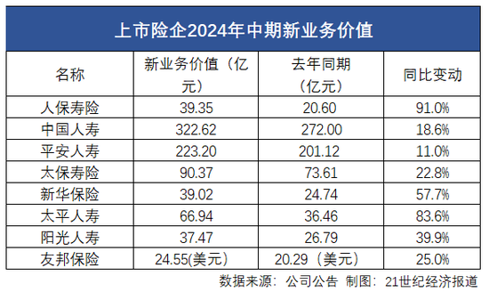 上半年,八家险企均实现了新业务价值的两位数增长,其中:人保寿险达成新业务价值39.35亿元,同比增长91%;太平人寿达成新业务价值66.94亿元,同比增长83.6%;新华保险达成新业务价值39.02亿元,同比增长57.7%;阳光人寿达成新业务价值37.47亿元,同比增长39.9%;友邦保险达成新业务价值24.55亿美元,同比增长25%;太保寿险达成新业务价值90.37亿元,同比增长22.8%;中国人寿达成新业务价值322.62亿元,同比增长18.6%;平安人寿达成新业务价值223.20亿元,同比增长11%。